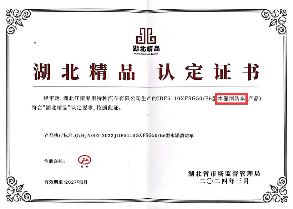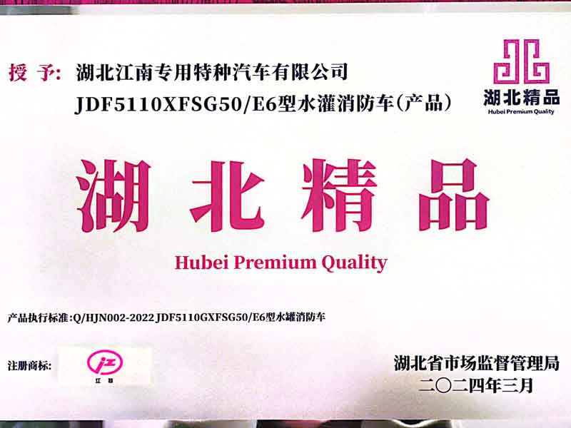 江南JDF5110GXFSG50/E6型水罐消防車(chē)獲得“湖北精品”榮譽(yù)稱號(hào)